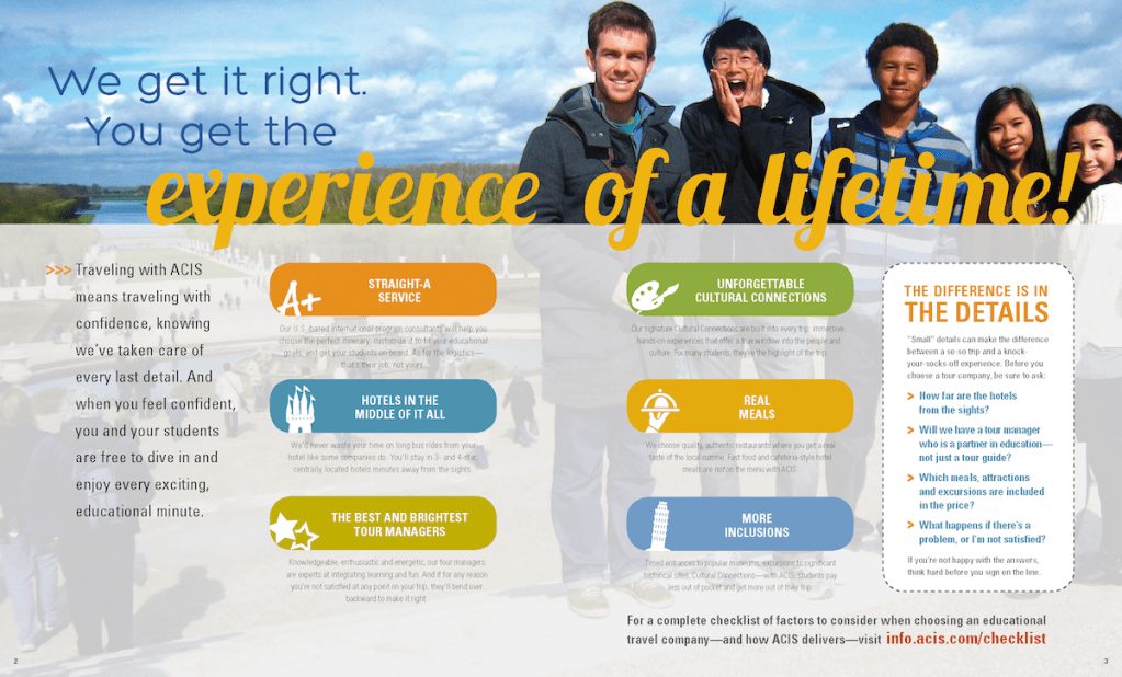 ACIS (American Council for International Studies) provides premium educational travel experiences for middle and high school students and their teachers. Their brand is built to reflect the immersive, excting, high-quality trips they offer. Deliverables: Catalogs, direct mail, website copy.